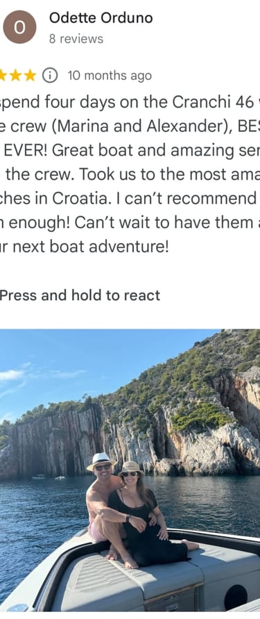 Aleksandar is a professional captain with extensive knowledge of the Dalmatian islands and years of experience navigating yachts up to 24 meters. Marina is the heart of guest relations—a booking manager, stewardess, physiotherapist, volleyball coach, and experienced Airbnb host, known for her kindness and attentive care. Together, they curate every detail: choosing the perfect yacht with the client, organizing food and drinks based on personal preferences, and crafting routes that transform a day at sea into a truly unique journey.